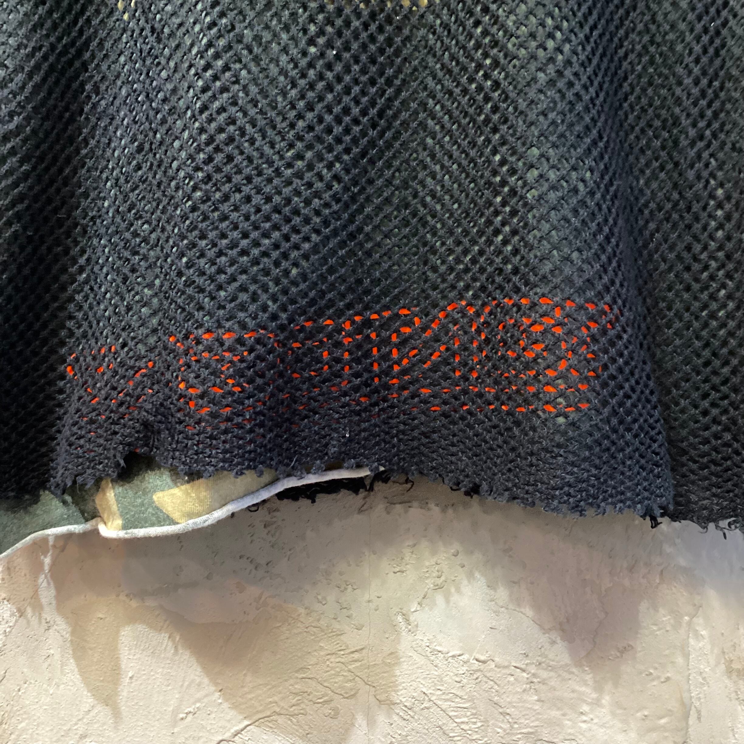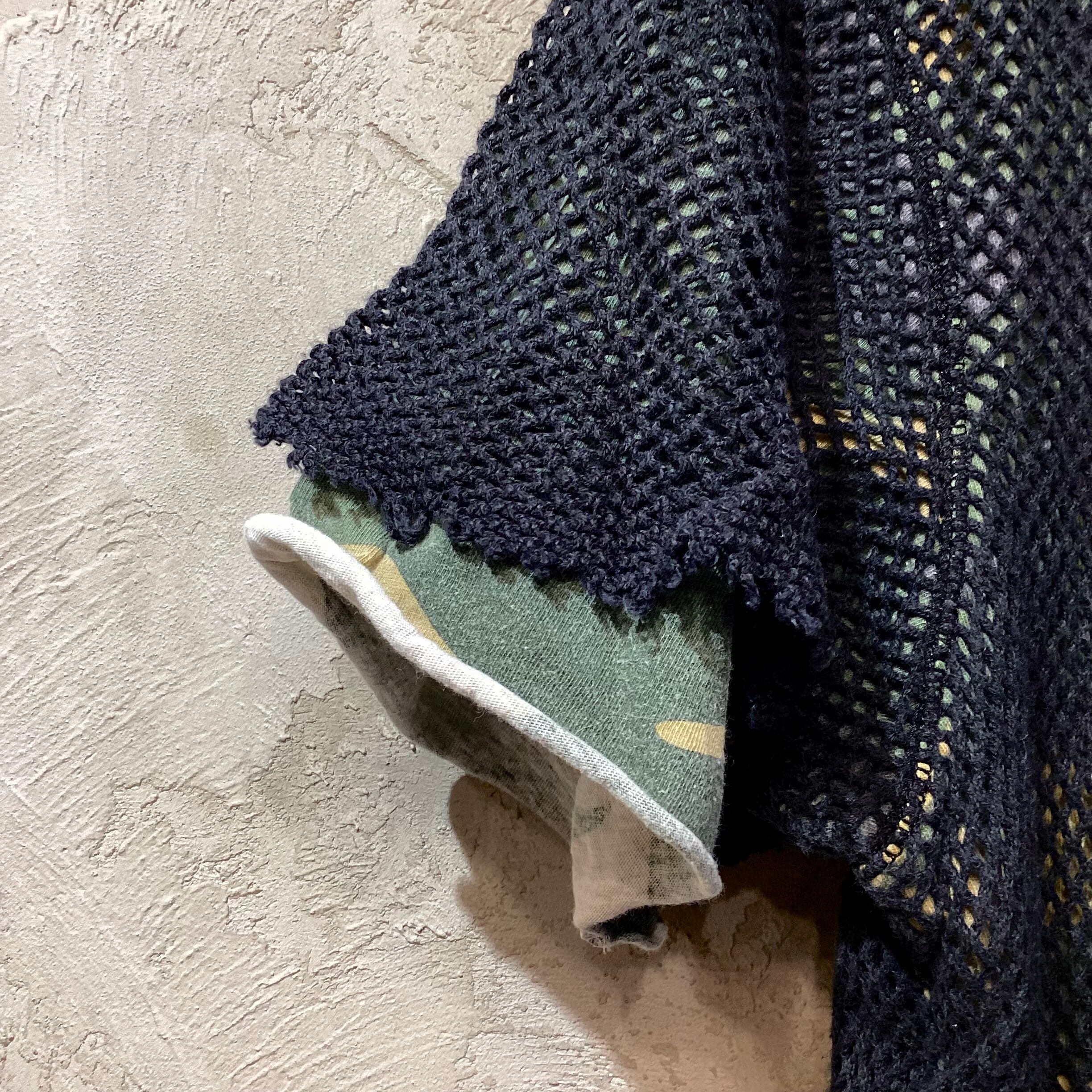 内側に袖、裾がカットオフされたオリジナルカラーのカモフラージュに目の粗いメッシュ素材のカットソーがレイヤードされています。