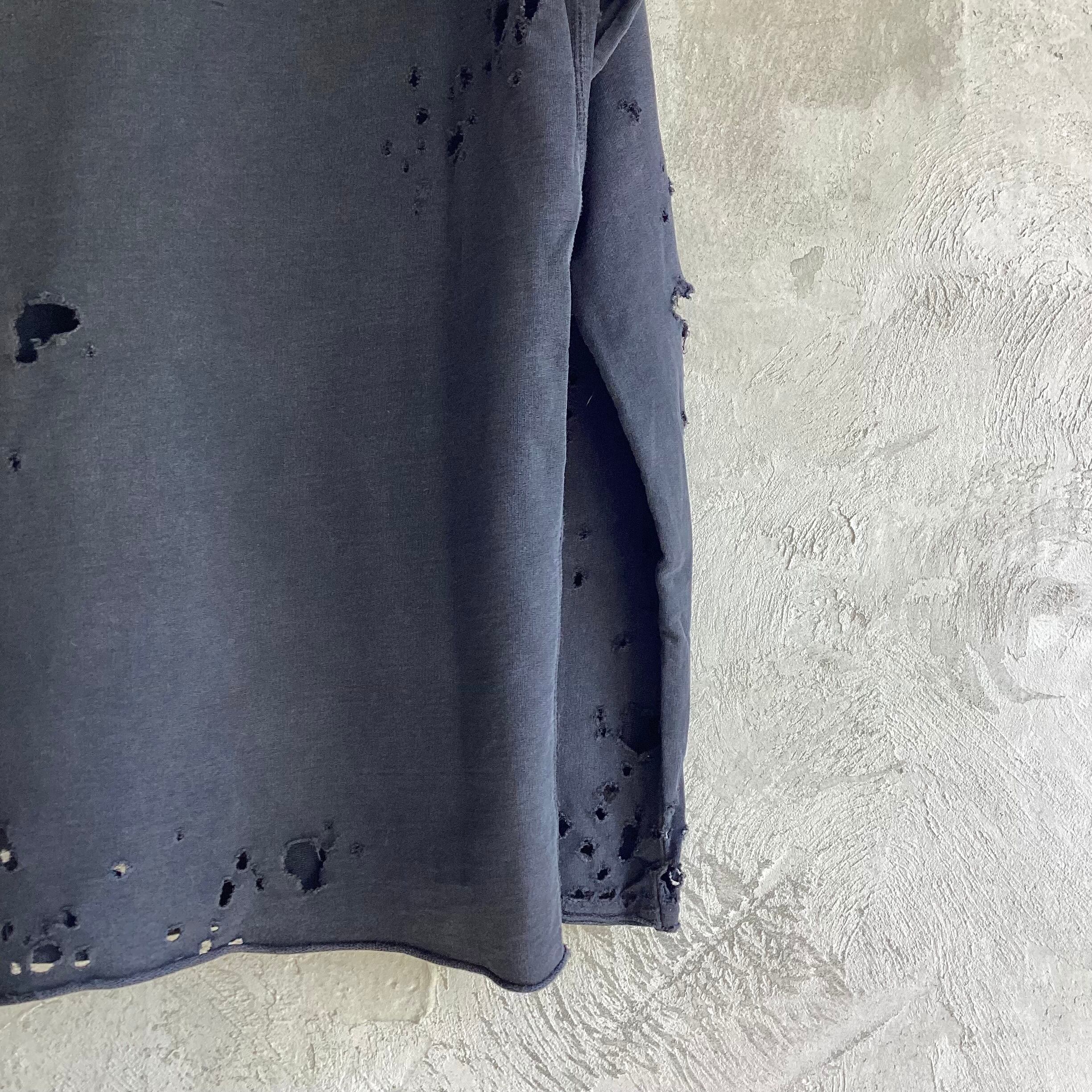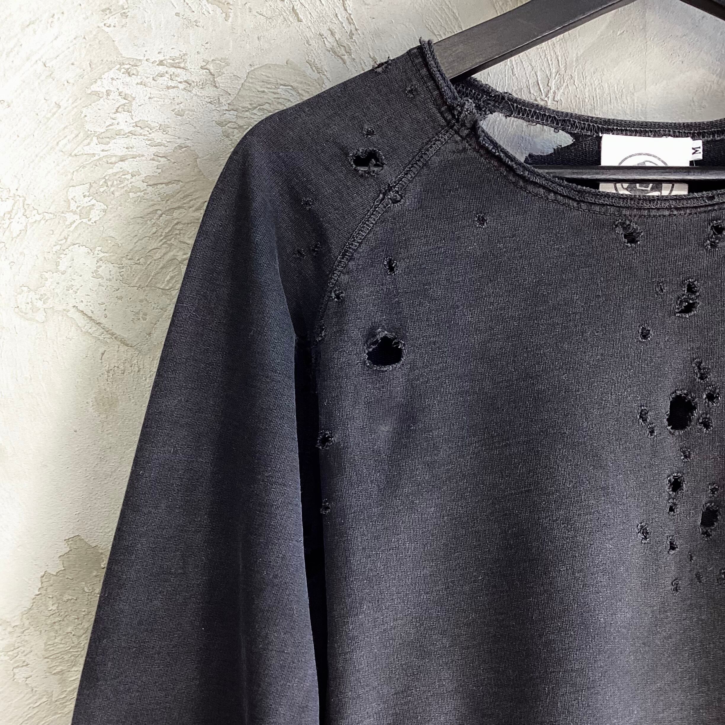 オリジナルのラグランスリーブの薄手の裏パイル生地に襟、袖口、裾が切りっぱなしになり、左袖口にステッチでブランドロゴ、バックの襟元付近にアイコンが同色で刺繍されています。