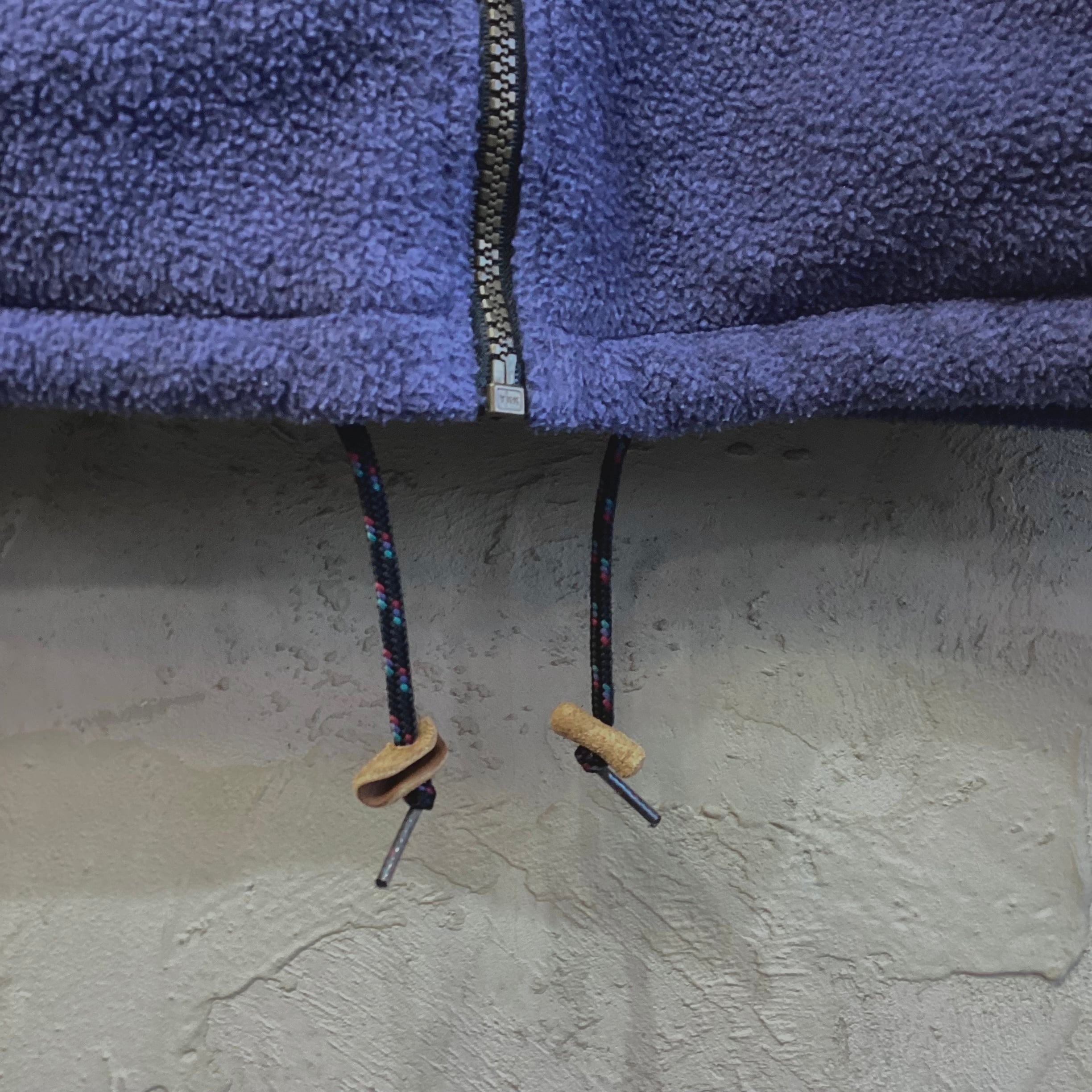 両サイド腰部分にチロリアンテープが付くハノ字のジップポケットが2ケ所付き、フード口と裾にレザーストッパーの付く紐のドローコードが付きます。