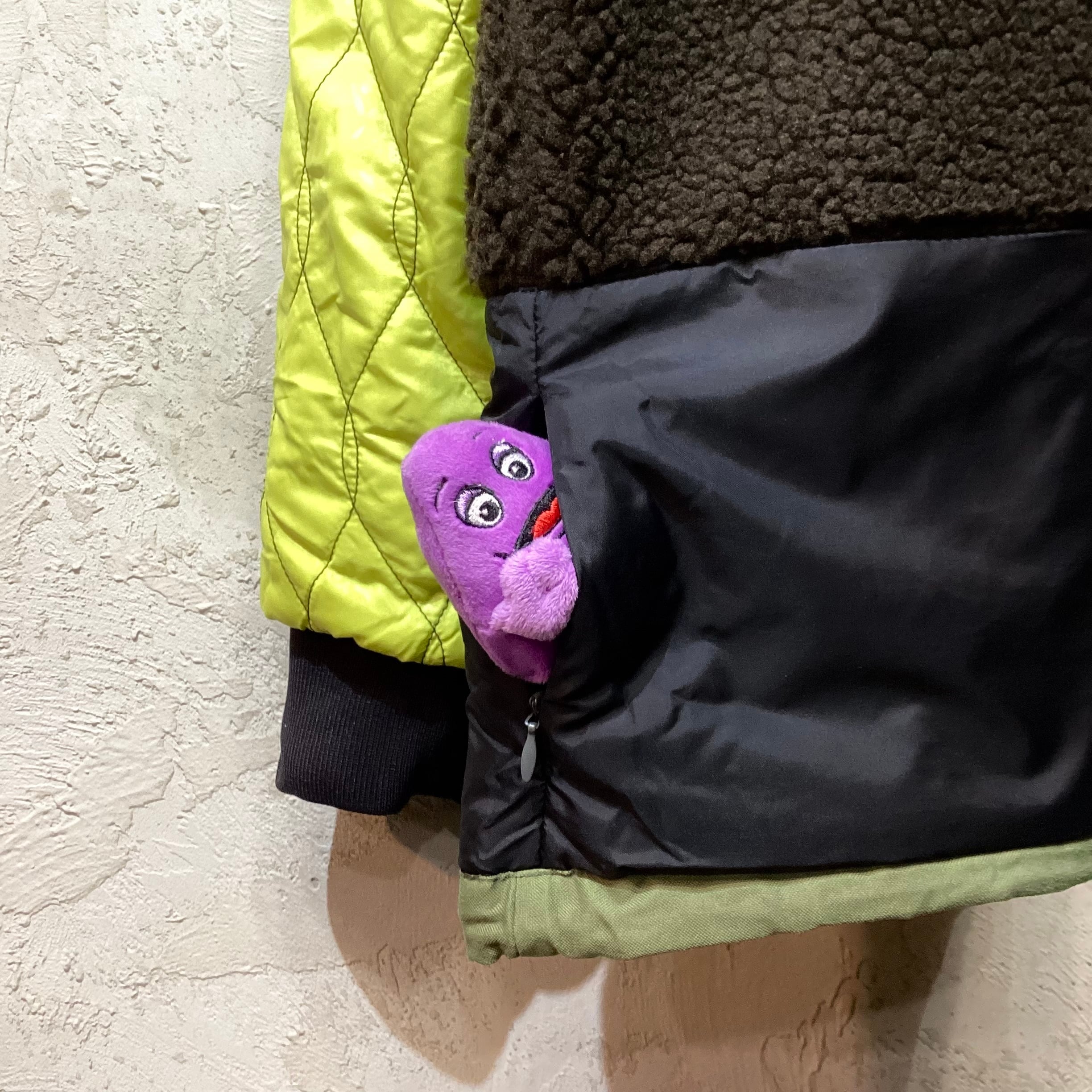 内側の身頃部分と襟にかけてフリースボアが施されており、立てるとマジックテープのチンストラップでネックウォーマー状の形態に変化します。