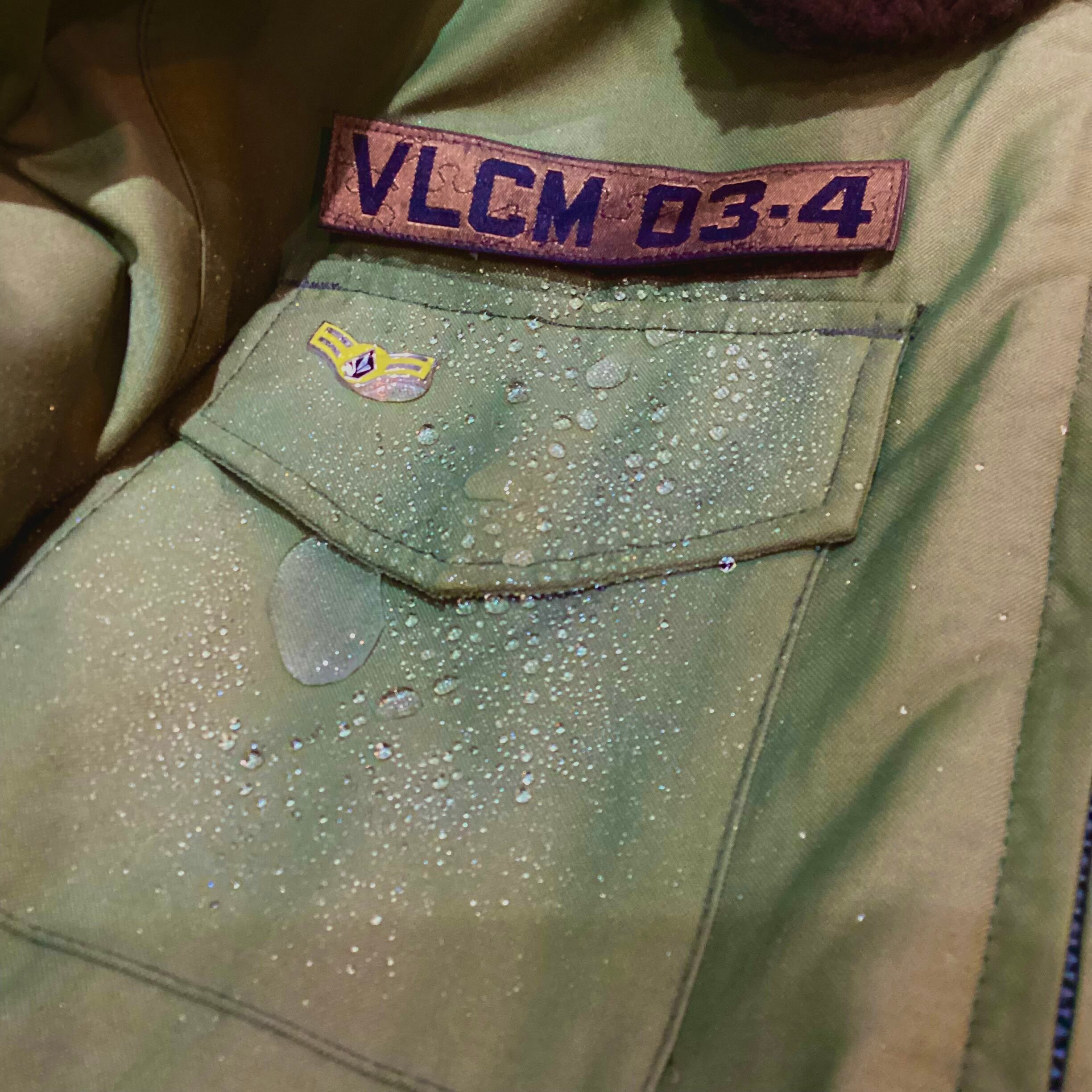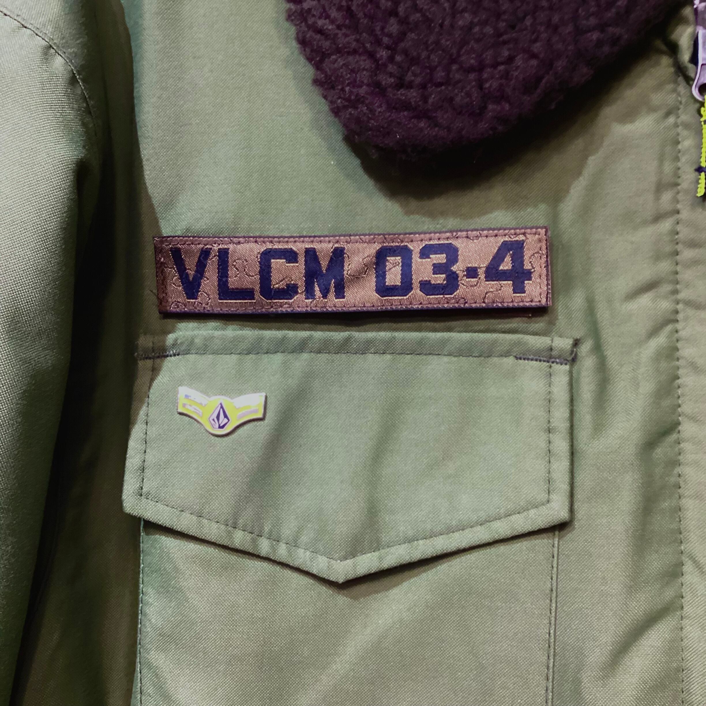 右胸部分にミリタリー調のベルクロのワッペンが ”S.N.O ARMY” と ”VLCM 03-4” の二通りのワッペンが付き、その下に ”VOLCOM SNOW ARMY” のピンズが付きます。