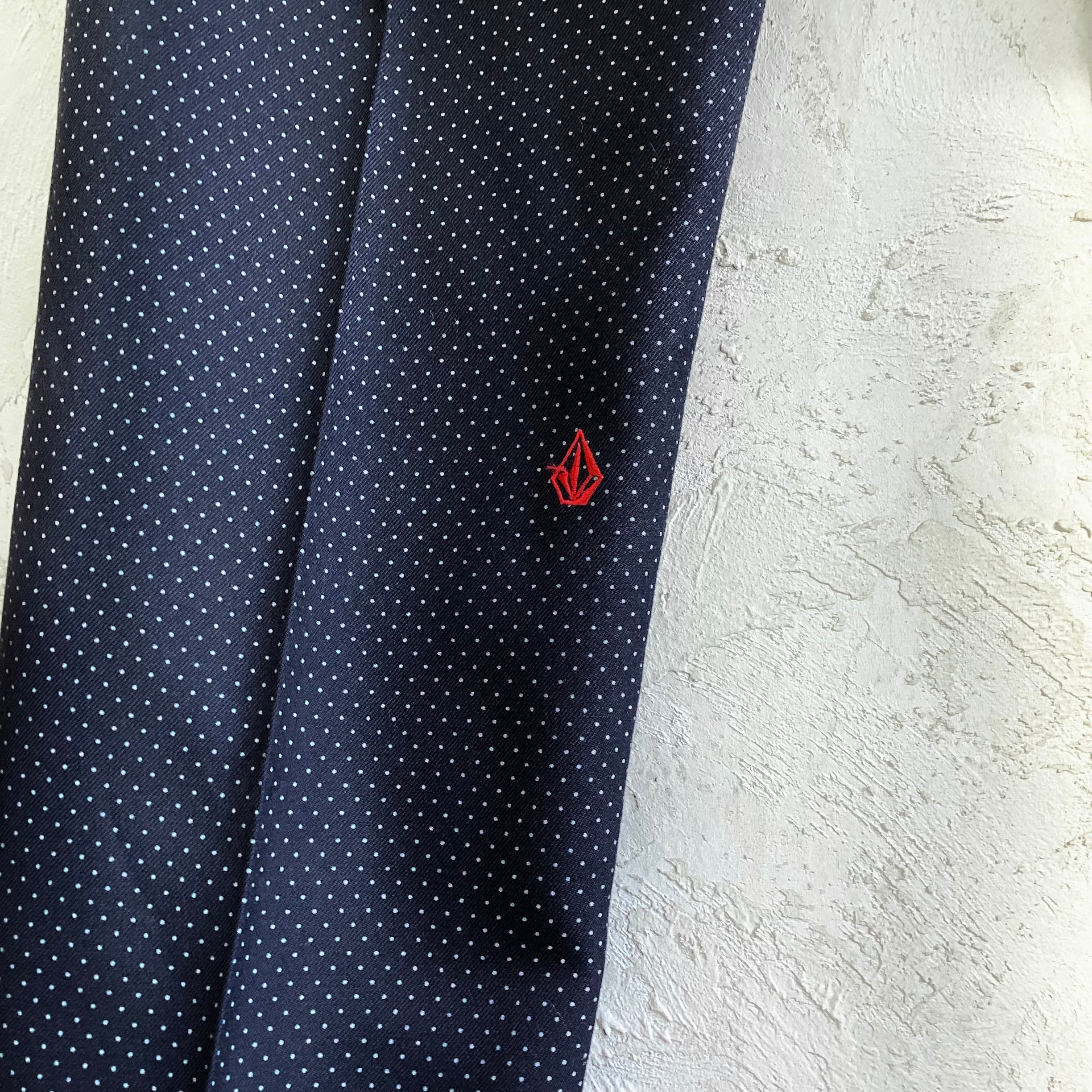 襟元と左袖口に赤の刺繍で ”VOLCOM” のLOGOが刺繍が施して有り、バックは”VOLCOM” お得意の斜めの切り返しになっています。