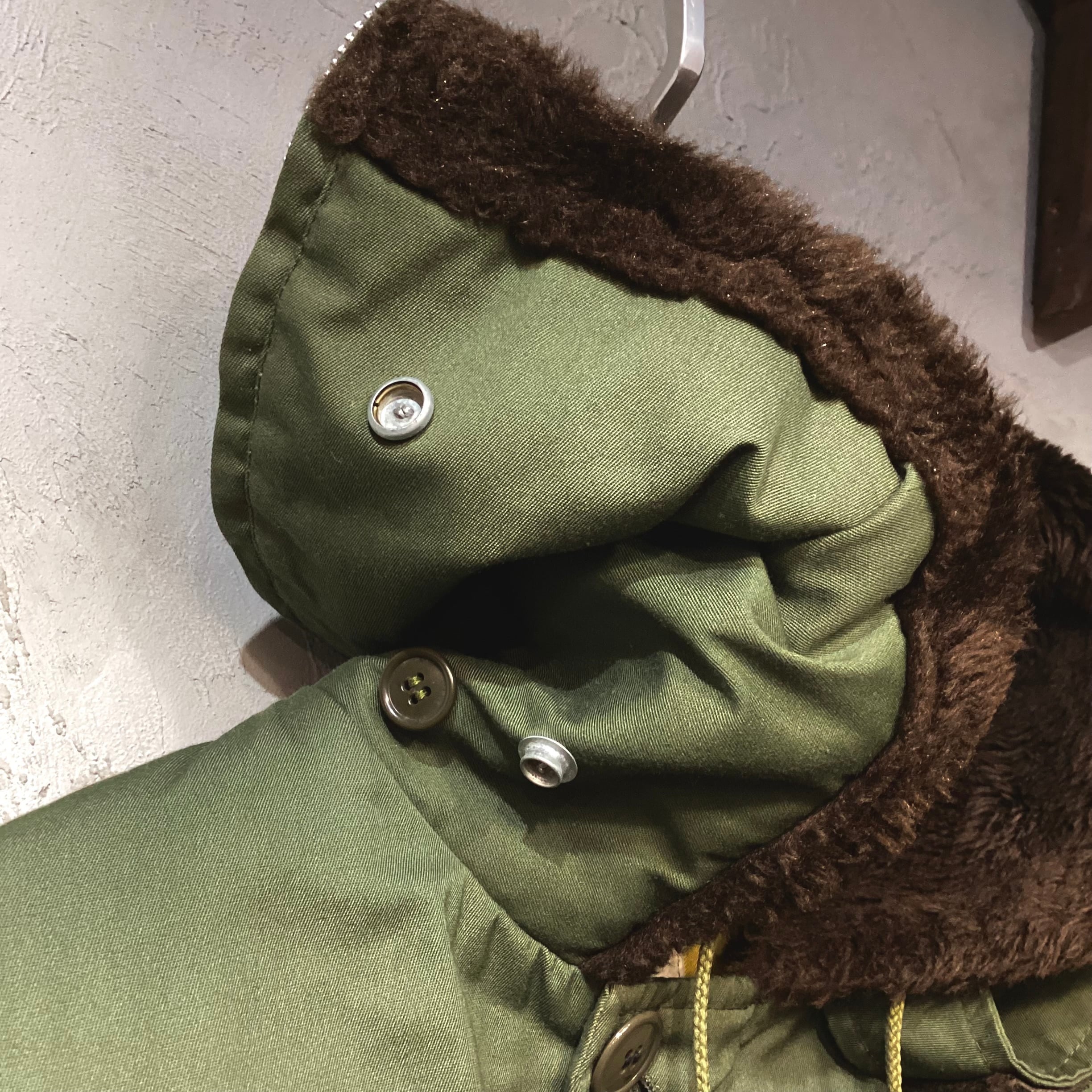 表地はコットンで裏地は光沢のあるサテン地のキルティング素材になり、フード内側とチンストラップ裏にブラウンのボアが付きます。