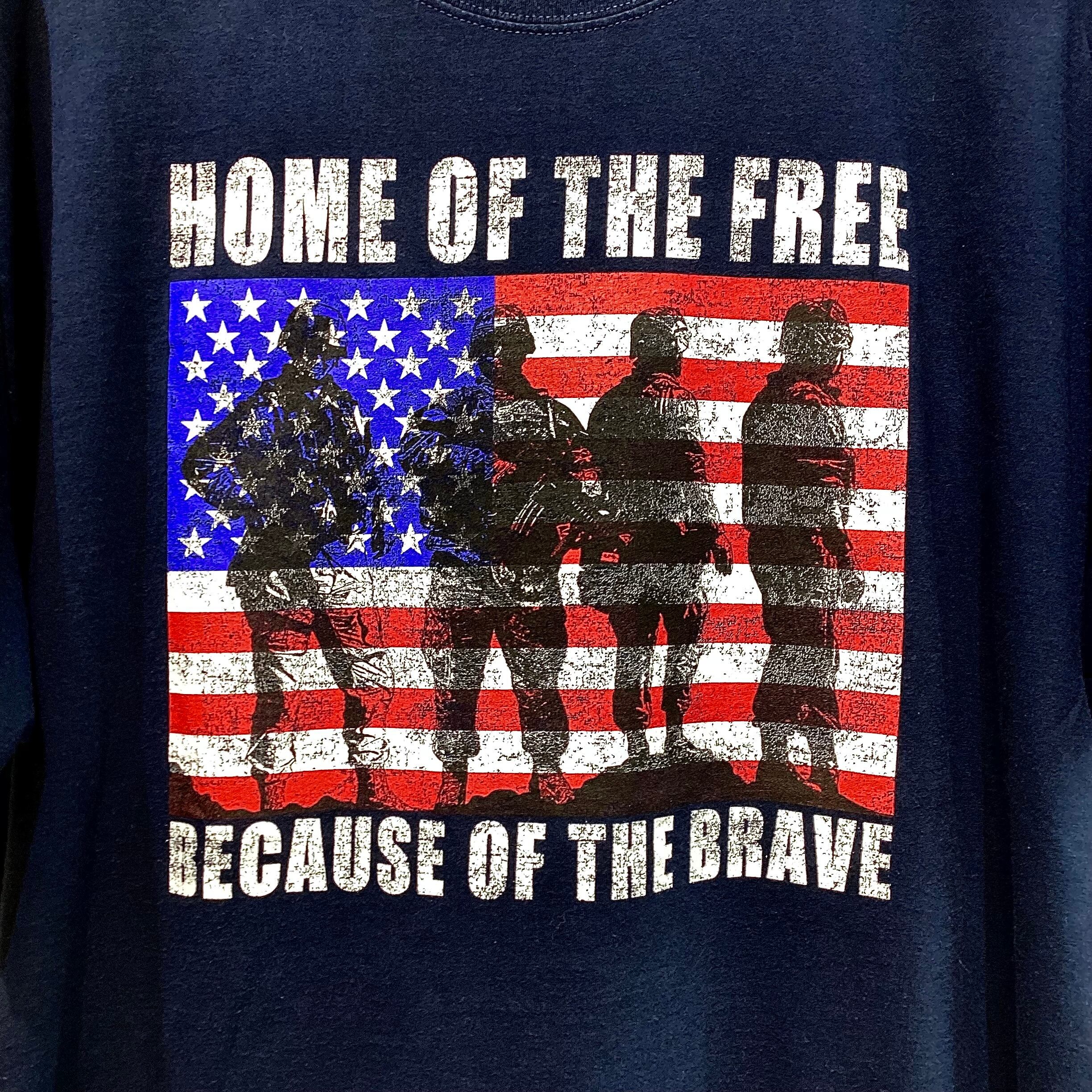 フロントに『 HOME OF THE FREE BECAUSE OF THE BRAVE 』( 自由の国、勇者の国 )のメッセージと星条旗の中に装備した兵士のシルエットがたたずむグラフィックがプリントされています。